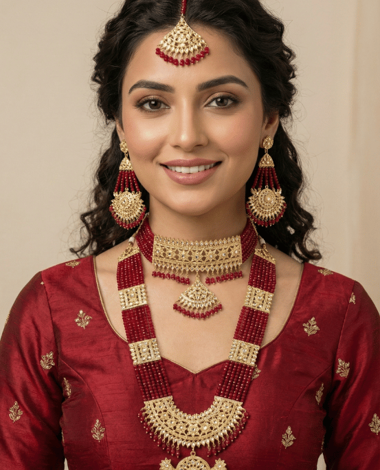 Step into timeless grandeur with the EleganceGlow Royal Mehroon & Gold Bridal Heritage Jewelry Set, a magnificent ensemble crafted to elevate your wedding and festive look. Designed with traditional artistry and premium craftsmanship, this set reflects the richness of Indian bridal culture—perfect for brides, bridesmaids, and anyone who loves regal luxury.